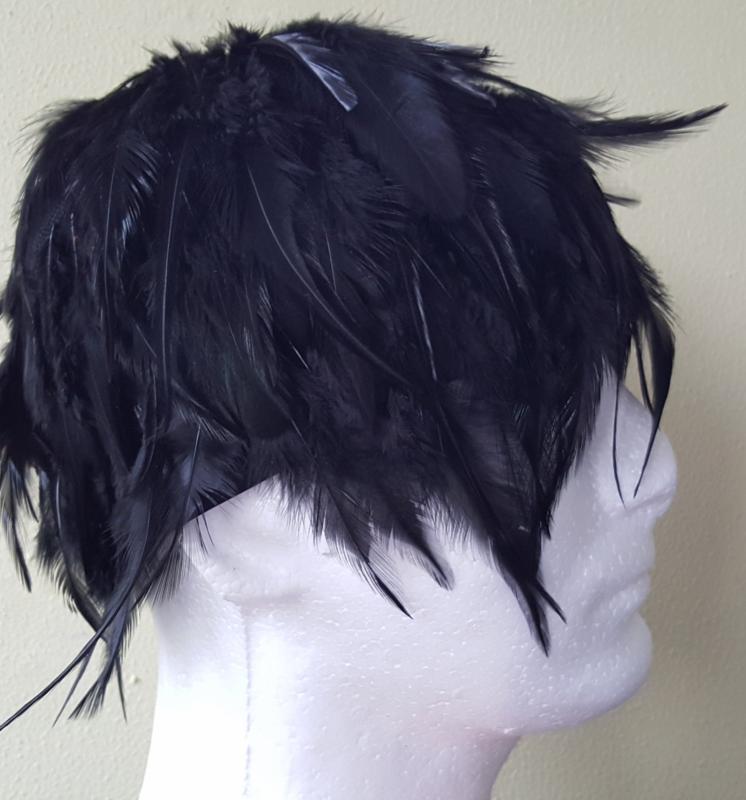 Feathers are meticulously hand-glued onto a lightweight, breathable polyester-blend cap, designed for comfort and durability. The cap features an elastic edge, allowing it to stretch for a secure fit—one size fits most adults.